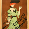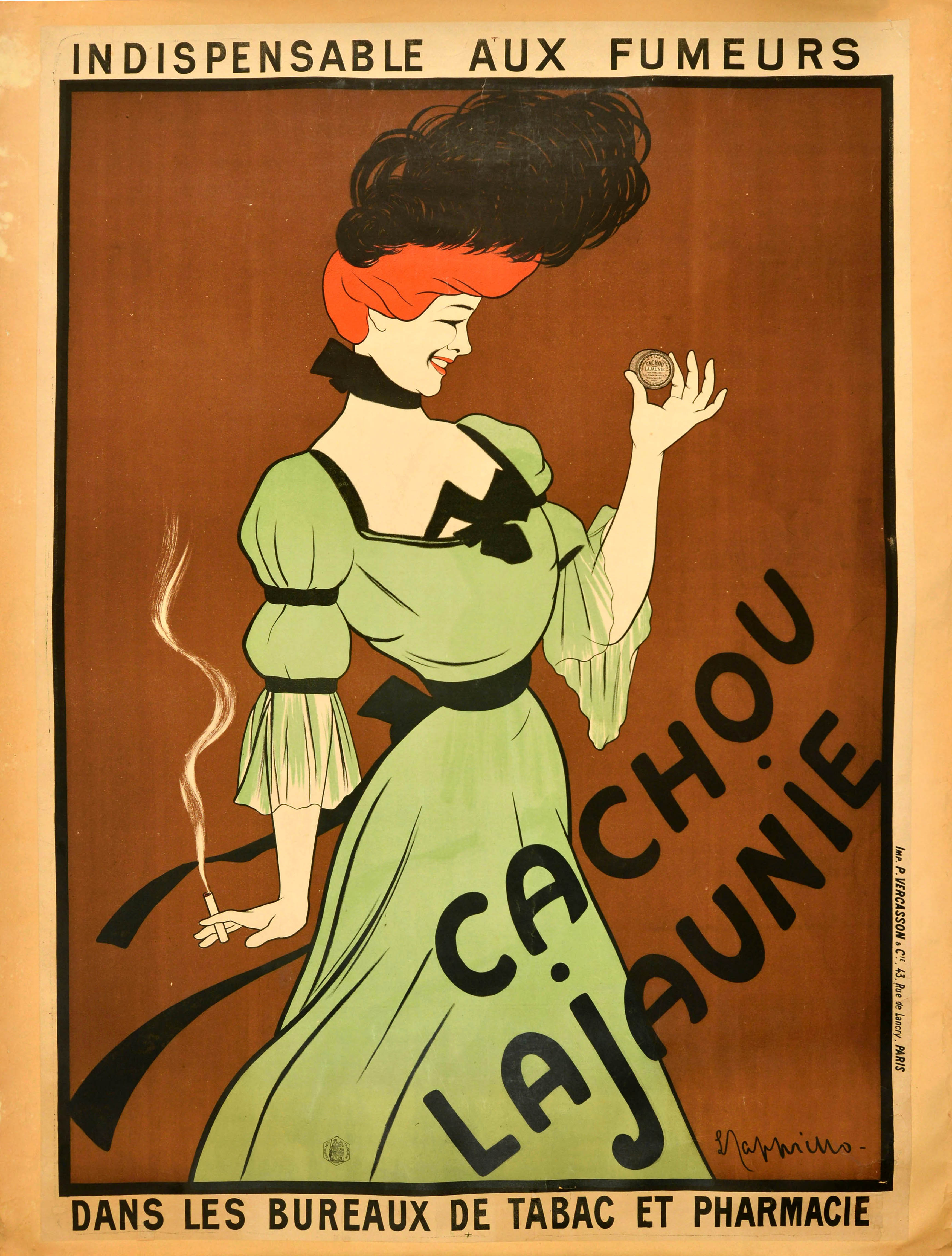 Original antique advertising poster for Cachou Lajaunie, a French brand of liquorice and mint sweets - Design by the renowned Italian artist Leonetto Cappiello (1875-1942) depicting an elegant smiling lady in a green dress with black bows and a feather headdress, seen holding a cigarette in one hand and a small, round, yellow tin of sweets. Developed by pharmacist Leon Lajaunie in 1880 as a medicinal lozenge and breath freshener, sweets were marketed as "indispensable for smokers" to perfume and freshen the mouth. The caption in French reads - Essential for smokers. Available at tobacconists and pharmacies / Indispensable aux fumeurs. Dans les bureaux de tabac et pharmacie. Printed by P. Vercasson & Cie, Paris. Good condition, repaired tears, creasing, staining, restored paper losses, small paper losses, backed on old linen.