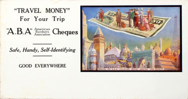 Original vintage advertising poster for the American Bankers Association: Travel Money For Your Trip “A.B.A” Cheques Safe, Handy, Self-Identifying Good Everywhere Travel on A.B.A. cheques while seeing the world. Great painting featuring a group of well dressed travellers wearing suits, dresses and hats, some sitting on their luggage and others standing by the edge admiring the view of the world below as they fly on an A.B.A cheque styled like a magic flying carpet over landmarks and monuments of various world cities, including St Paul's Cathedral in London, skyscrapers in New York, the Coliseum in Rome, the pyramids in Egypt and the Eiffel Tower in Paris with the information text on the left in stylised black letters. The American Bankers Association (ABA) is a trade association that was founded in 1875 by James Howenstein as a result of the Panic of 1873; now based in Washington DC. Horizontal. Good condition, creases, defects and staining in margins.