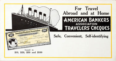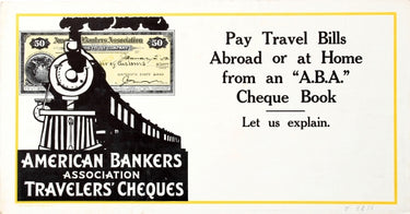 Original vintage advertising poster for the American Bankers Association Travelers Cheques. Double-sided poster with an image on one side of a stylised black and white steam train in front of a travelers’ cheque with the information text below and on the side: Pay Travel Bills Abroad or at Home from an “A.B.A.” Cheque Book Let us explain - American Bankers Association – Travelers Cheques and, on the other side, a stylised black and white image of a steam ship above a travelers’ cheque with the text: For Travel Abroad and at Home American Bankers Association Traveler’s Cheques Safe, Convenient, Self-identifying Issued in $10, $20, $50 and $100 bordered by yellow lines. The American Bankers Association (ABA) is a trade association that was founded in 1875 by James Howenstein as a result of the Panic of 1873; now based in Washington DC. Printed in New York by John H. Smith. Horizontal. Good condition, creases on margins, staining, and a small pencil mark in the bottom right corner on the front side.