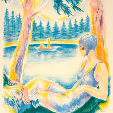 Original vintage poster promoting the Swiss summer and winter sports resort of Arosa located in the canton of Graubunden featuring a peaceful image depicting a lady in a swimming suit sitting on the grass between trees in the foreground framing the scene with people on a small rowing boat on the lake and the title text below. Artwork by the Swiss designer Herbert Berthold Libiszewski (Herbert Berthold Libis / Hugo Laubi; 1897-1985). Lithograph printed by Gebr Fretz A.G. Zurich. Large size. Very good condition, light folds, backed on linen.