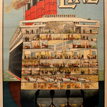 Original vintage Cunard poster - To all parts of the World - featuring a fantastic image of a detailed cut-out of a cruise ship showing each level from the double bottom and tanks and coal burners up to the boat deck and bridge, including illustrations of people enjoying their cruise on the various decks and rooms for the different classes from first class to third class: promenade deck, garden lounge, restaurant, cabins, dining saloon, smoking room, state rooms, ballroom etc., as well as the stores and baggage rooms below and the choppy sea and smoke rising from four funnels outside with stylised text above and below. Excellent condition.