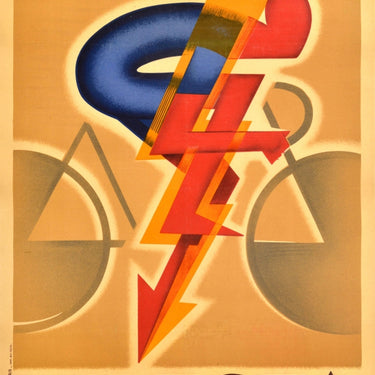 Original antique advertising poster for a French brand of bicycles - Cycles Dilecta - featuring a colourful dynamic Art Deco design depicting a stylised figure of a cyclist leaning forward riding a bike at speed with a lightning bolt arrow pointing down to the title text below. Created by Affiches Gaillard, Paris. Large size. Good condition, minor staining, minor creasing, light folds, backed on linen.