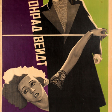 [ON RESERVE 27/05/2026] Original vintage Soviet movie poster for the Russian release of the 1926 German silent film Смеем ли мы молчатъ / Should We Be Silent / Durfen Wir Schweigen directed by Richard Oswald and starring Conrad Veidt, Walter Rilla and Henri De Vries. Stunning constructivist design showing the stylised image of a young lady in the bottom left with one arm over a white horizontal line against a purple background and an older man standing on the right side in a long dark coat against a green background, the title text above and main actor's name running diagonally between the two figures in white letters. Good condition, small repaired tears in margins and stains.