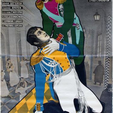Large original vintage movie poster for the historical drama in 7 parts directed by Aleksandr Ivanovsky, The Decembrists (декабристы / Dekabristy), starring Gennadiy Michurin, Valentin Lebedev, Vladimir Maksimov, Yevgeni Boronikhin and Sergei Shishko. Great image featuring two men in colourful uniform in the foreground with people dancing on one side and a street scene at night on the other side in the background, designed by the notable Soviet artists, the Stenberg Brothers (Vladimir 1899-1982; Georgii 1900-1933) and Yakov Ruklevsky (1884-1965). Very good condition, backed on japan paper.