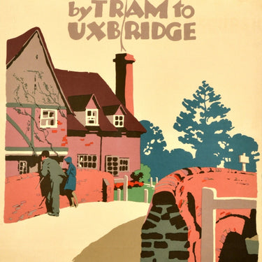 Original vintage travel poster - Denham by Tram to Uxbridge - featuring a colourful image by the notable British poster artist Frank Newbould (1887-1951) depicting a lady and man standing on a stone bridge with a fence in the foreground and a house and trees in the background, the smoke from the chimney rising through the bold stylised title text above. Printed by Waterlow and Sons Ltd Litho London Dunstable and Watford. Good condition, creasing, tears, minor staining.