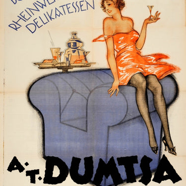 Large original vintage advertising poster for A. T. Dumtsa, an Austrian chain of shops selling Bordeaux and Rhine wines, foreign liquors and other drink and food delicatessen products. Great Art Deco design by Atelier Hans Neuman showing a fashionable young lady wearing an orange dress seating casually on a large blue armchair holding a drink with a tray of bottles and glasses nearby, the stylised text above and below in blue and black letters: Bordeaux-Rheinweine, Ausl. Liquors, Delikatessen – A. T. Dumtsa – 1. Augustinerstr. 12 – 1. Kollnerhofg. 6. Good condition, restored folds and minor tears, backed on linen.