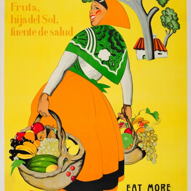Original vintage food advertising poster in Spanish, English, French and German recommending the viewer to eat more Spanish Fruit featuring a bright and colourful image on a yellow background by Bartolozzi of a Spanish lady wearing a traditional orange dress with a white shirt, green scarf and orange headscarf, carrying two baskets full of apples, oranges, bananas, grapes and other fruits with a house and tree in the distance. Printed in Spain by Ortega, Valencia. Very good condition, restored minor loss on margins, backed on linen.