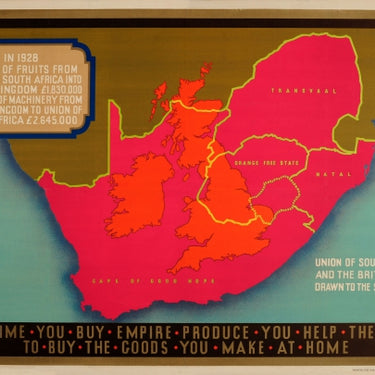 Original vintage historic Empire Marketing Board poster - Every Time You Buy Empire Produce You Help The Empire To Buy The Goods You Make At Home - issued by the Empire Marketing Board (EMB 1926-1933; formed to promote intra-Empire trade), code B.0.3. Colourful illustrative map featuring a map of South Africa highlighted in pink marking the Cape of Good Hope, Orange Free State, Transvaal and Natal with a map of the UK in the centre in orange - Union of South Africa and the British Isles drawn to the same scale - with an information box above: In 1928 imports of fruits from Union of South Africa into United Kingdom £1,830,000 Exports of machinery from the United Kingdom to Union of South Africa £2,645,000. Printed for H.M. Stationery Office by John Horn Ltd London and Glasgow. Horizontal. Large size. Fair condition, restored folds, restored tears, restored minor loss on margin, restored stain along entire bottom margin, backed on linen.