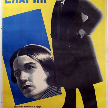 Rare original vintage movie poster for Инженер Елагин / Engineer Elagin aka Specialist / Специалист - a Soviet drama set in the New Economic Period (NEP; 1917-1922) about an engineer who finds out his son is a foreign spy - directed by Vladimir Feinberg and starring Nicholas Monks, Barbara Myasnikov, Fedor Nikitin, Valery Plotnikov and Alexander Temnov. Great photomontage featuring a stern looking man with a moustache wearing a smart suit and coat with one hand holding a gun in his pocket against a yellow background with the face of lady in a blue square below the title text.