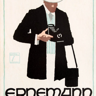 Original vintage advertising poster for Ernemann cameras (founded in 1889, merged with ICA in 1926) by the notable German poster artist Ludwig Hohlwein (1874-1949). Great artwork showing a smartly dressed man wearing a hat and holding a folding camera in front of him, the text below in stylised black letters. Printed in Germany by O. Consee, Munchen. Very good condition, faint browning in margins, backed on cardboard.