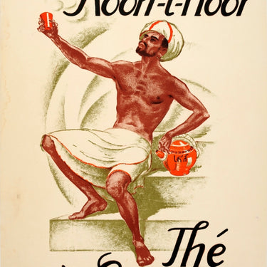 Original vintage tea drink advertising poster for a black tea produced in Sri Lanka (Ceylon): Kooh-i-Noor Ceylon Tea / Thé Kooh-i-Noor Thé de Ceylan. Great illustration of a man wearing a traditional sarong and turban, sitting on a step and holding up a tea cup with a teapot by his side. Lithograph printed by W.Wassermann, Basel. Large size. Good condition, staining on margins, repaired tears, backed on linen.