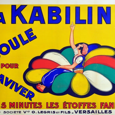 Large original vintage advertising poster for La Kabiline boule pour raviver en 5 minutes les etoffes fanees / Kabiline dye revives faded fabrics in 5 minutes. Bright image on a yellow background featuring a girl surrounded by colours forming the petals of a flower. Horizontal. Good condition, restored folds, minor loss and tears, backed on linen.