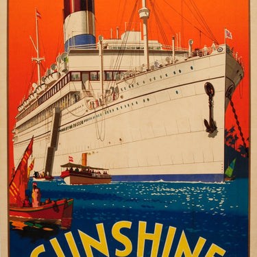 Original vintage travel advertising poster promoting Lamport and Holt Line Sunshine Cruises featuring a stunning Art Deco style design of a Lamport and Holt cruise ship with a deep red white and blue funnel flying a Union Jack flag in front of a bright orange sky in the background with smaller ferry boats taking passengers to the palm tree lined shore and sailing boats on the blue sea below. Founded 1845 by William James Lamport and George Holt, the Lamport and Holt shipping line was based in Liverpool England. Printed by Liverpool Stationery Co. Good condition, restored pin holes, restored folds, backed on linen.