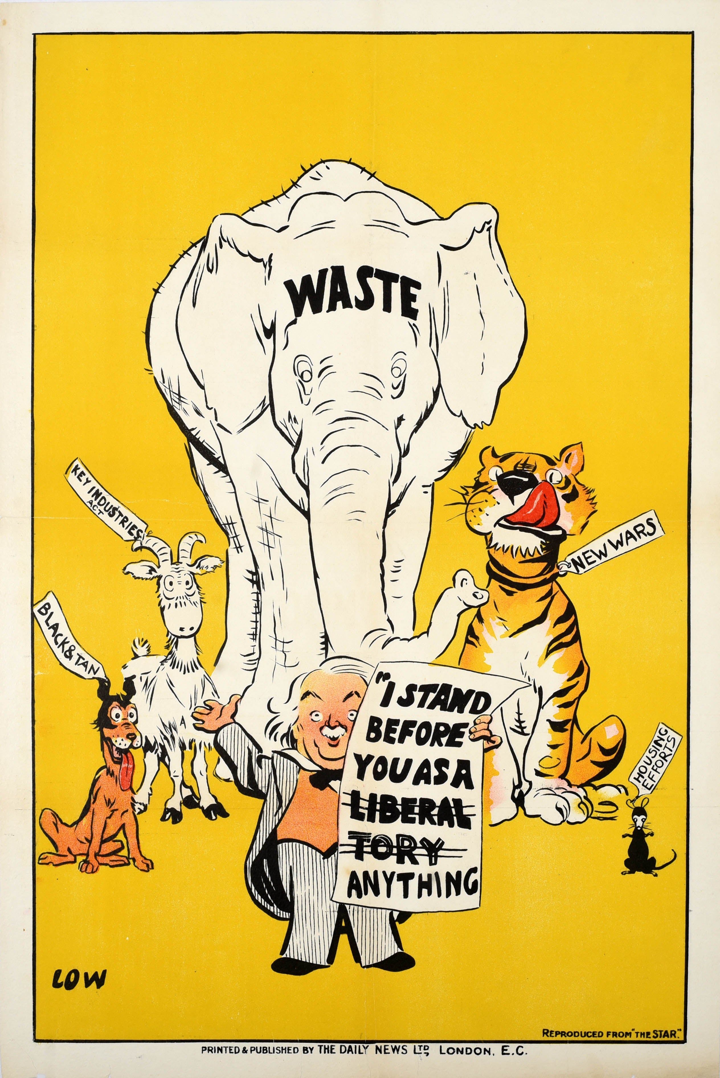 Original antique political poster - I Stand Before You as a Liberal Tory Anything - featuring a satirical cartoon design by the notable New Zealand caricaturist Sir David Alexander Cecil Low (1891-1963) depicting a politician in a pinstripe suit and waistcoat holding up a paper sign that reads - I Stand Before You as a Liberal Tory Anything - with the words Liberal and Tory crossed out on a yellow background, an elephant marked Waste behind him symbolising the "elephant in the room" with a dog labelled Black and Tan, a goat labelled Key Industries Act, a tiger labelled New Wars and a mouse labelled Housing Efforts on the sides. David Low moved to London in 1919 and worked for The Daily News and its evening paper The Star until 1927. Founded in 1846 The Daily News was known for its liberal political stance. Reproduced from The Star. Printed and Published by The Daily News Ltd London. Good condition, restored tears, restored folds, small restored paper losses, minor staining, minor creasing, backed on linen.
