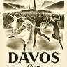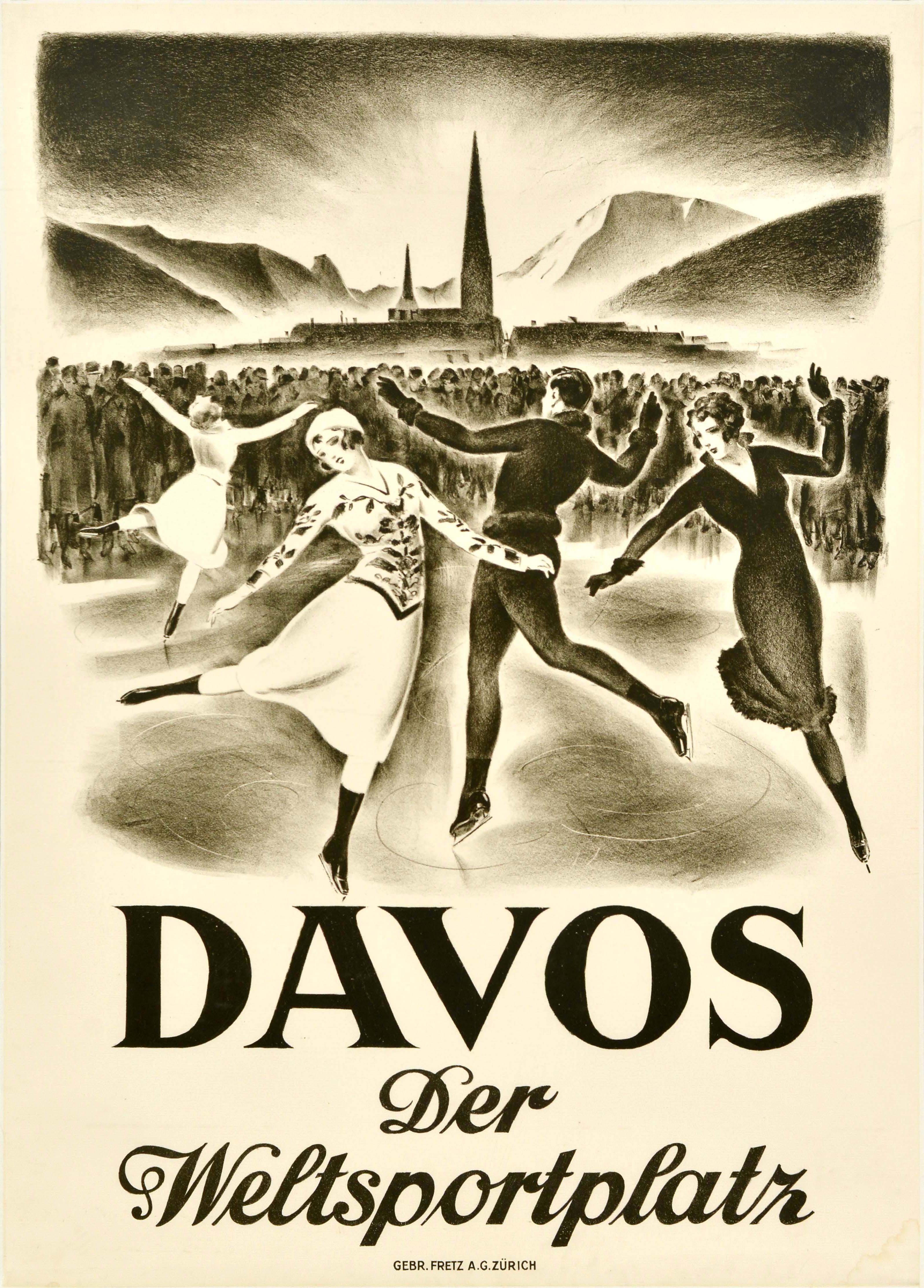 Original vintage winter sport travel poster for the ski resort Davos Der Weltsportplatz / The World Sports Venue in Switzerland featuring a great black and white Art Deco design by the notable German-Swiss artist Carl Moos (Karl Franz Moos; 1878-1959) depicting people ice skating in front of a crowd with the town of Davos in the background, the sunshine glowing behind the spire of the historic St Johann Church between the Swiss Alps mountains in the distance, the bold and stylised title text below. Printed in Zurich. Good condition, repaired tears, staining, backed on linen.