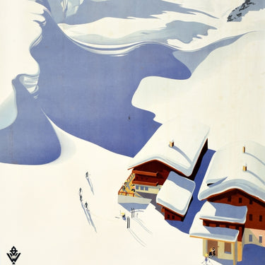 Original vintage winter sport and skiing travel poster for Austria featuring stunning artwork by Erich von Wunschheim depicting skiers on a snowy mountain next to snow topped chalets with people on the terrace and skis in the snow casting long shadows in the sunshine below mountain peaks on the horizon and a clear blue sky in the background. Issued by the Austrian Advertising service of the Federal Ministry of Trade and Transport, Vienna. Poor condition, trimmed on margins, restored tears, pinholes, and paper losses, backed on linen.