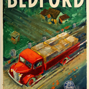 Original vintage advertising poster for the British truck manufacturer Bedford featuring an aerial view of a loaded red Bedford truck driving in the countryside past a house and a field with the text above and the Bedford and General Motors logos below. Based in Luton Bedfordshire, Bedford Vehicles was founded in 1930 by Vauxhall Motors to produce commercial lorries, trucks and vans; the company was taken over by the American company General Motors in 1925. Printed by Lund & Balling - Albert C. Petersen. Very good condition, small bumps on margins, small tape on corners, writing on bottom right corner.