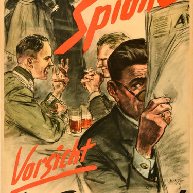 Original vintage propaganda poster - Beware of spies be careful when talking! / Achtung Spione Vorsicht bei Gesprachen! - featuring an illustration of two soldiers talking over a beer with a man in the foreground listening whilst pretending to read a newspaper, the warning text in black and red letters above and below. Printed by Wilhelm Limpert, Berlin. Good condition, repaired tears, browning, staining on top edge, backed on linen.