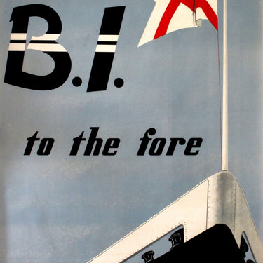 Original vintage poster advertising the British India Steam Navigation Company. This shipping company was formed in 1856 to carry mail between Calcutta, India, and Rangoon, Burma. In 1914 the company became part of P&O group but continued to operate under its own name until 1972. Great image of a ship's bow featuring the B.I. insignia with the flag flying above and the lettering - B.I. to the fore - in the distinctive black and white funnel pattern of BI ships. Fair condition, foxing and soiling, minor repaired tears.