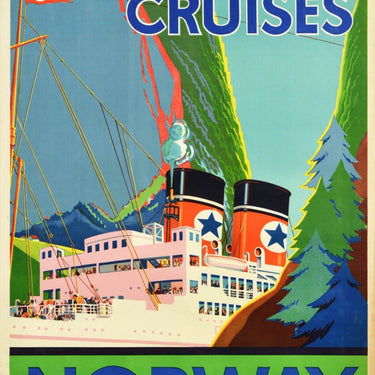 Original vintage cruise travel poster for Blue Star Cruises Norway featuring a colourful image of a ship sailing through a fjord between steep cliffs with trees in the foreground, the passengers enjoying the scenic view from the decks, the bold text above and on the green border below. The Blue Star Line was a British shipping company that operated passenger and cargo services around the world from 1911 to 1998. Printed in England by Jarrold & Sons Ltd., Norwich & London. Good condition, creasing, tears on edges, minor staining.
