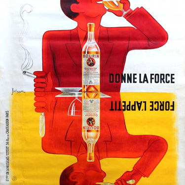 Large original vintage drink advertising poster for Quinquina Bourin. Great image on a white and yellow background of a man drinking a glass of the alcohol with one hand and holding a cigarette in the other hand, the image reflected below with the man holding a fork of food to his mouth with one hand and holding a knife in the other hand, the empty glass on the table with the text above and below the dividing table line: Donne la Force / Force l'Appetit (Gives Strength / Strengthens the Appetite). Artwork by Pierre (b 1909) and Jacques (1903-1985) Bellenger. Excellent condition.