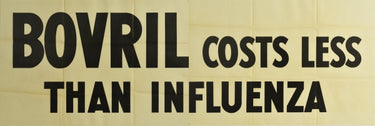 Original vintage food advertising poster for Bovril - Bovril costs less than influenza - featuring bold black lettering on a white background. Printed in Britain in the 1930s, this campaign used puns and word play to resemble the public announcement / propaganda posters of the time. Developed by John Lawson Johnston in the 1870s, Bovril is a beef meat extract paste often used to make a hot drink or added as a flavour to stews and soup recipes when cooking or as a spread. Horizontal. Large size. Good condition, folds, creasing, minor staining, two sheet poster.