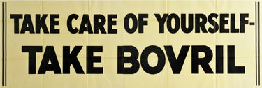 Original vintage food advertising poster for Bovril - Take care of yourself Take Bovril - featuring bold black lettering on a white background with black borders on the sides. Printed in Britain in the 1930s, this campaign used puns and word play to resemble the public announcement / propaganda posters of the time. Developed by John Lawson Johnston in the 1870s, Bovril is a beef meat extract paste often used to make a hot drink or added as a flavour to stews and soup recipes when cooking or as a spread. Horizontal. Large size. Good condition, folds, tears, creasing, paper losses, two sheet poster.