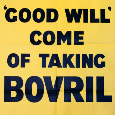 Original vintage advertising poster for Bovril, a meat food extract often used to make a hot drink or add flavours to stews and soups. The message reads: "Good Will" Come of Taking Bovril. Printed in Britain in the 1930s, this series of posters resemble the public announcement/propaganda posters of the time.