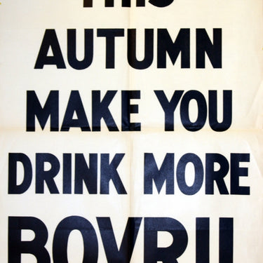 Original vintage advertising poster for Bovril, a meat food extract often used to make a hot drink or add flavours to stews and soups. The message reads: This Autumn Make You Drink More Bovril. Printed in Britain in the 1930s, this series of posters resemble the public announcement/propaganda posters of the time.
