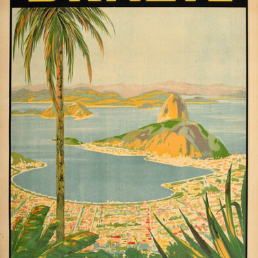 Original vintage travel poster for Brazil in South America featuring a scenic view from the Christ the Redeemer statue on Mount Corcovado towards Sugarloaf Mountain in Guanabara Bay Rio de Janeiro with trees in the foreground and hills on the Atlantic Ocean bay in the distance, the bold title in yellow above and details below - Brazilian Information Bureau 511 Fifth Avenue New York. Printed in Brazil by Comp. Lith. Ypiranga Sao Paulo. Good condition, restored tears, staining, backed on linen.