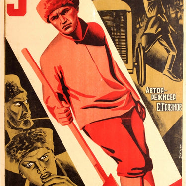 Original vintage Soviet film poster pinted in Ukraine for the release of Russian film Izlom - Излом - Злам - Break - featuring a dynamic constructivist design of a man holding a spade in the centre with two men looking over suspiciously on one side and a third man holding up a baton on the other side, the title above in stylised red and white letters with the rest of the text in white and black letters. Fair condition, folds, small losses, tears and creases in margins.