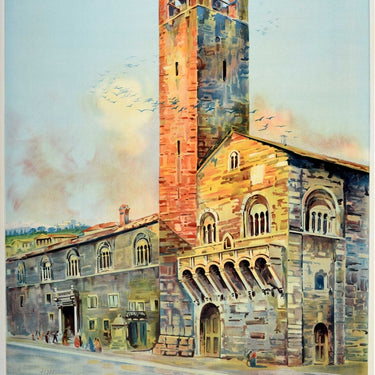 Original vintage travel poster for Brescia issued by the Italian Tourism Board ENIT featuring a flock of birds flying around the stone tower of the historic Palazzo Broletto Palace with people walking under the Piazza Balcony and along the civic government office building, the snow topped Alps mountains visible in the distance and the bold title and logos below. The ancient town of Brescia is located the Lombardy region of Italy. Good condition, restored tears, restored paper losses on edges, restored folds, minor creasing, minor staining, backed on linen.