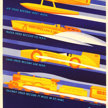 Original vintage poster published by the Empire Marketing Board celebrating the records accomplished by British manufactured transportation vehicles: Britain First Always – Buy British. Colourful and dynamic Art Deco design by the British artist R. Granger Barrett listing the records: Air speed record of 407 ½ M.P.H. featuring a plane above the text; Water speed record 110 M.P.H. featuring the Miss England II speed boat; Land speed record 246 M.P.H. featuring a racing car with the Union Jack British flag; Railway speed record 77 Miles in 57 ½ mins. featuring a speeding train, all four vehicles zooming past on diagonal lines from right to left in yellow and orange colours over a dark blue background with the text in stylised blue letters above and below. Designed, printed and published by William Brown & Co. Ltd., London. Very good condition, restored minor loss on left margin, backed on linen.