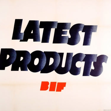 Large original vintage advertising poster for the British Industries Fair - the most visited attraction for two weeks every year - exhibition centre in Birmingham England built in 1920 between Castle Bromwich Aerodrome and the railway line; in 1933 the first diesel locomotive was displayed at the BIF. Fantastic eye-catching design featuring stylised lettering with the BIF logo font in red below. Published by Waterlow & Sons. Horizontal. Very good condition, minor restoration to folds, backed on linen.