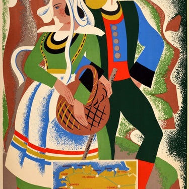 Original vintage travel poster for Brittany - Bretagne Societe Nationale Des Chemins De Fer Francais - issued by French National Railways Company featuring colourful artwork of a man and lady in traditional clothing and hats, the lady holding a wicker basket and the man wearing clog style shoes, with a route map below of the region including train links to Nantes, Vannes, Le Croisic, La Baule, Quiberon, Lorient, Quimper, Douarnenez, Brest, Roscoff, Lannion, St Brieuc, Paimpol, Dinard, St Malo and Rennes, the bold title text, SNCF logo and a map of France showing the Brittany area on the margin. Printed by Alsacienne Strasbourg. Very good condition, restored tears, minor creasing, backed on linen.