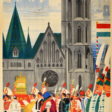 Original vintage travel poster for Budapest featuring a great illustration by Jeges Erno (1898-1956) depicting a festival procession of people in traditional dress walking past the historic 11th century Matthias Church on Holy Trinity Square with a boat and a bridge over the Danube River in front of the domes and buildings on the city skyline in the background. Good condition, restored paper losses in top left corner, restored creasing, restored tears, backed on linen.