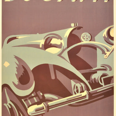 Original vintage advertising poster for a famous Bugatti car. Stunning Art Deco graphics by Gerold Hunziker. Excellent condition, backed on linen.