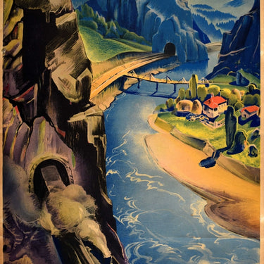 Original vintage travel poster for Bulgaria featuring a scenic view of a steam train travelling through a tunnel on a rocky cliff above a river with a bridge linking a riverside town to the railway and trees and mountains in the distance. Artwork by the award winning Bulgarian watercolour artist and poster designer Angel Tilov (1912-1972). Good condition, restored pinholes, restored tears, restored folds, restored paper losses, staining, ink stamp in bottom right corner, backed on linen.