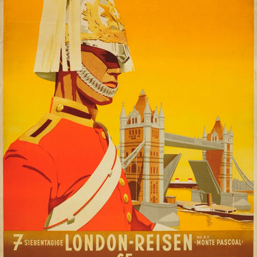 Original vintage cruise ship travel advertising poster promoting special fares from RM.65 Reichsmark offered by the Hamburg-South America Steamship company for 7 seven day trips from Hamburg in Germany to London during July August September on the Monte Pascoal (1930-1944) ocean liner - 7 Siebentagige London Reisen mit M.S. Monte Pascoal Hamburg-Sud Hamburg Sudamerikanische Dampfschifffahrts Gesellschaft. Great artwork by the German painter and poster artist Ottomar Anton (1895-1976) featuring a British Army Life Guard in uniform wearing a helmet with a white plume standing in front of Tower Bridge raised to let a boat sail through on the River Thames against the bright background, the text below. The Hamburg Sud Shipping Line was founded 1871. Good condition, restored tears, restored paper losses on edges, staining, backed on linen.