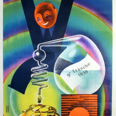 Original vintage advertising poster for the Loterie Nationale - National Lottery - featuring a colourful image of a scientist in a suit celebrating a successful experiment as gold coins drop down. Designed by Derouet Lesacq.