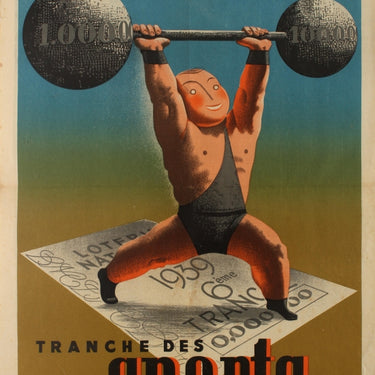 Original vintage advertising poster for the French National Lottery dedicated to sport - Loterie Nationale Tranche des Sports 1939 6eme tranche. Great artwork featuring a strong man lifting heavy weights with the ends designed as money bags indicating the prize amounts and the mat below detailing information about the lottery, the title text above and below in stylised black and red letters. Artwork by Edgar Derouet (1910-2001) and Charles Lesacq (1909-1940). Printed in France by Imp. Lafayette, Paris. Very good condition, folded as issued, minor creases and folds in margins.