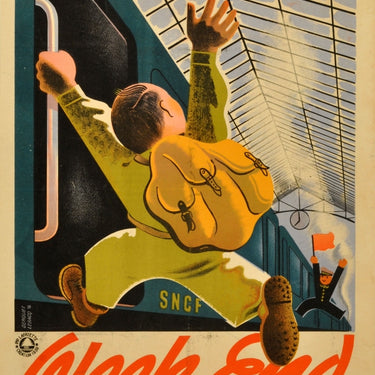 Original vintage poster for the National Lottery - Loterie Nationale, Weekend - 4th tranche 1939, tranche ferroviaire (railway). Fun image of a man with a backpack running onto an SNCF train with a guard waving a flag and steam billowing under the glass panelled station roof. Very good condition, minor stains, backed on linen.