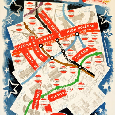Original vintage colourful London Transport travel advertising poster by the notable British graphic artist, printmaker and art teacher Clifford Ellis (1907-1985) and his wife Rosemary Ellis (1910-1998) with a Christmas cracker at the top including a small dog brooch and pack of cards with a paper: "Q. Why is a railway time-table like life? A. Because it is full of ups and downs" above a London Underground tube map and London's main shopping streets on top of pages of a shop catalogue marked with people's names against a blue shaded background adorned with white stars and the London Underground roundel logo below. Very good condition, light staining on margins, backed on linen.