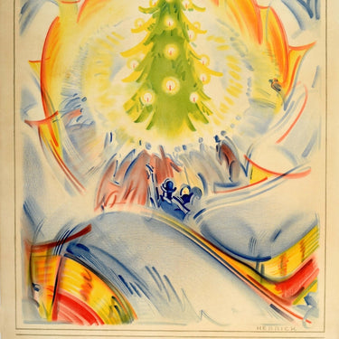 Original vintage London Transport travel poster - The jolly way to keep au fait and do the thing that's done, Requires no fuss; Just take a bus and join the General fun - featuring the poem with the General London Transport logo below colourful artwork by Frederick Charles Herrick (1887-1970) depicting a festive Christmas tree with brightly shining candle lights surrounded by shapes of people with a decorative design on the corners above. Printed by The Baynard Press. Good condition, restored paper losses, restored tears, staining, browning, backed on linen.