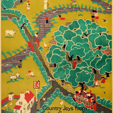 Original vintage London Transport travel poster - Country Joys from Ealing Common Station General Route 98 (Sunday Only) - featuring stunning artwork by the British artist Heather Perry (Herry; 1893-1962) showing people on a red rover open topped double decker bus with a sign on the side reading Traveller's Joy driving along a lane in the countryside with people enjoying the nature and outdoors by swimming and paddling, playing with a toy boat and fishing on a river, playing tennis and cricket, hiking, camping, feeding pigs with other farm animals including sheep and a cow in the fields, riding a horse and birdwatching, walking the dog and having a picnic under the shade of trees with chickens running by a Red Lion pub and the information below with the General logo and printed text in the bottom left corner reading - To Mark Finished on the Octave of All Saints 1929 Herry Perry. Ealing Common is located in West London designated a common land in 1866; the open area includes an avenue of chestnut trees, a closed park and a local protected conservation area. The Ealing Common underground station was opened in 1879. The Catholic Octave of All Saints takes place in November. Printed by The Dangerfield Printing Co., Ltd, London. Good condition, restored tears, restored paper losses, minor staining, backed on linen.
