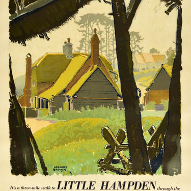 Original vintage London Transport travel poster featuring artwork by the English artist and designer Frederic Gregory Brown (1887-1941) of a picturesque view of the historic Little Hampden village in Buckinghamshire with the text below - It's a three-mile walk to Little Hampden through the beech woods from Great Missenden. You will pass through some of the most beautiful wooded countryside in England. The way is described and mapped for you in the book Country Walks: Third series. 270 miles in all. From newsagents and at bookstalls, 3d. - with the details next to the London Transport roundel logo - To Great Missenden by Green Line coach B from Victoria (Eccleston Bridge) or Marble Arch (Park Lane). Return Fare 3/9 Via Edgware Rd. and Wembley or by Metropolitan Line from Baker Street Station. Return fare 3/8. Printed by Baynard Press. Very good condition, restored tears, restored creasing, restored pin holes, backed on linen.