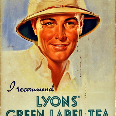 Original vintage tea drink advertising poster featuring a fantastic image of a smiling tea planter wearing a hat and looking out to the viewer with the stylised text below reading: I recommend Lyons' Green Label Tea Peter the Planter. Lyons is an Irish brand founded in Dublin in 1902 by the Lyons family; the company is now part of Unilever (since 1996). Backed on linen.