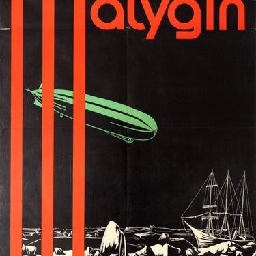 Original vintage movie poster for Malygin Bezwinger Der Nacht / Malygin Conqueror of the Night directed by Minikin-Sorokin, produced by SoyuzKino and released by Slaviafilm Prague. Fantastic design featuring a Zeppelin airship flying through the sky at night and a frozen icy wooden sailing ship below in the sea among the arctic icebergs and rocks in white against the black background, the title in red with a long capital M on the side. The icebreaker Malygin (1912-1940), named after the Russian arctic explorer Stepan Malygin (Stepan Gavrilovich Malygin; d 1764), met with the German Graf Zeppelin (1928-1937) airship on Franz Josef Land in 1931. Good condition, fold marks, tears and creases in margin.
