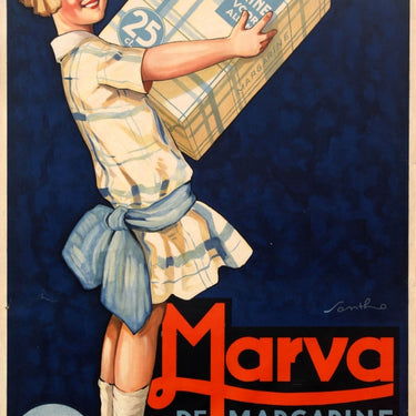 Large original vintage advertising poster for Marva margarine for all / Marva De Margarine voor Allen. Colourful design showing a smiling young girl holding a big margarine pack with the blue colour and pattern of her dress matching the design of the margarine packaging, the price for a pack of margarine is displayed as 25 ct. with the stylised text below in orange and blue letters. Printed by L. Van Leer & Co, Amsterdam. Good condition, minor tears on margins, creases and folds.