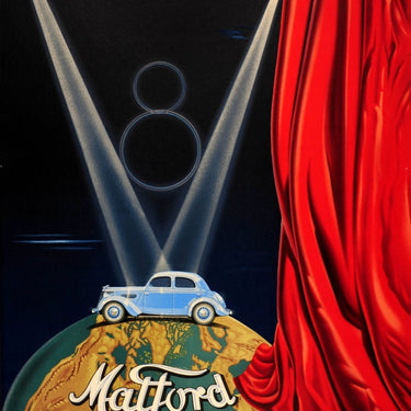 Original vintage car advertising poster for Matford V8 Une Nouvelle Vedette sur la Scene du Monde / A New Star on the World Stage featuring a fantastic design showcasing a shiny new blue Matford V8 classic car on display on top of the earth behind a red theatre curtain with two spotlights shining down on the car creating a V with two circles forming an 8 in the centre, the stylised text for Matford against the globe and slogan below with V8 formed in the word Vedette / Star. The Matford car and truck manufacturer was a joint venture between Ford and Mathis in France from 1934-1940. Printed in Paris. Large size. Good condition, restored pinholes, restored tears, small restored paper loss in corner, backed on linen.